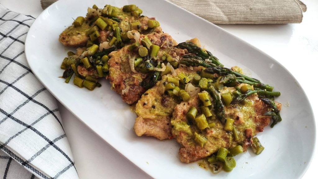 Die Spargel, die Hauptakteure dieses Rezepts, sind ein Frühlingsgemüse, reich an wohltuenden Eigenschaften. Dank ihres zarten und leicht kräuterigen Geschmacks passen sie perfekt zu Fleisch und schaffen ein ausgewogenes und schmackhaftes Gericht. Die Schweine-, Hähnchen- oder Kalbsschnitzel werden schnell in der Pfanne gebraten, bleiben zart und nehmen den Geschmack der Spargel und der Gewürze auf. Eine leichte Spargelcreme und, wenn gewünscht, ein Schuss Weißwein runden die Zubereitung ab und verleihen ihr eine samtige Konsistenz und einen umhüllenden Geschmack.
