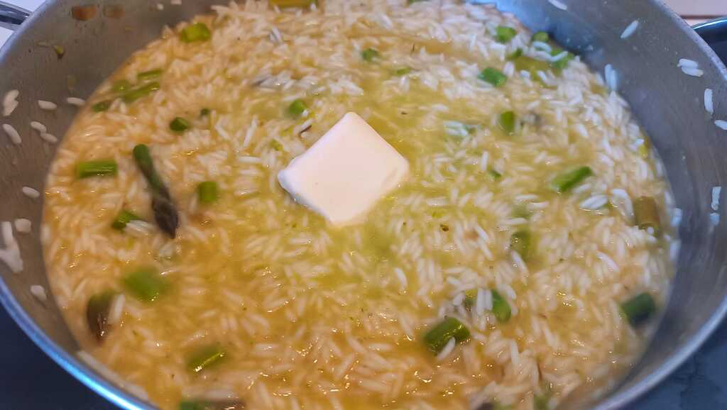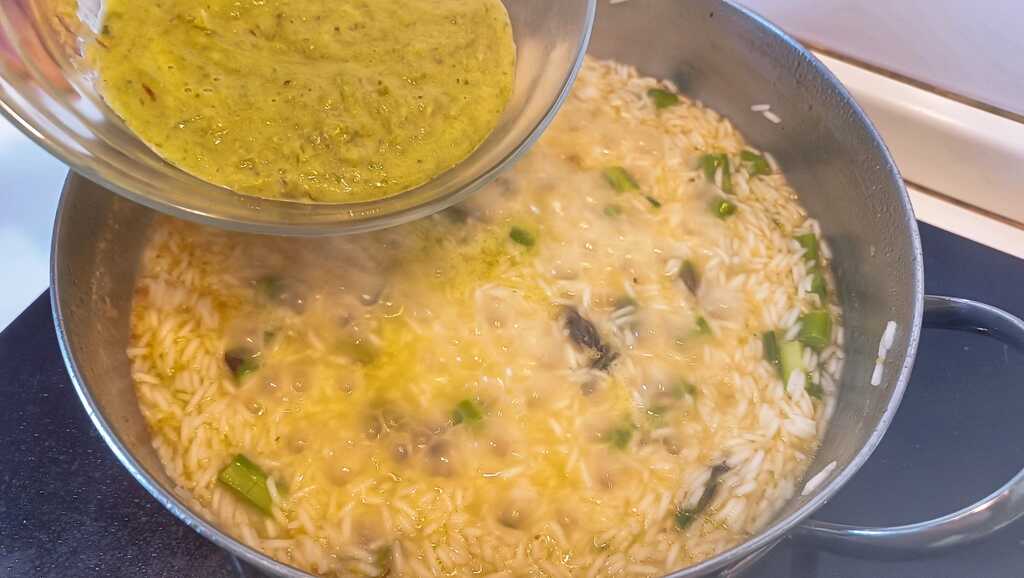• Wenn der Reis fast gar ist, die Spargelcreme hinzufügen und mischen