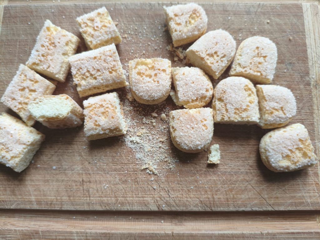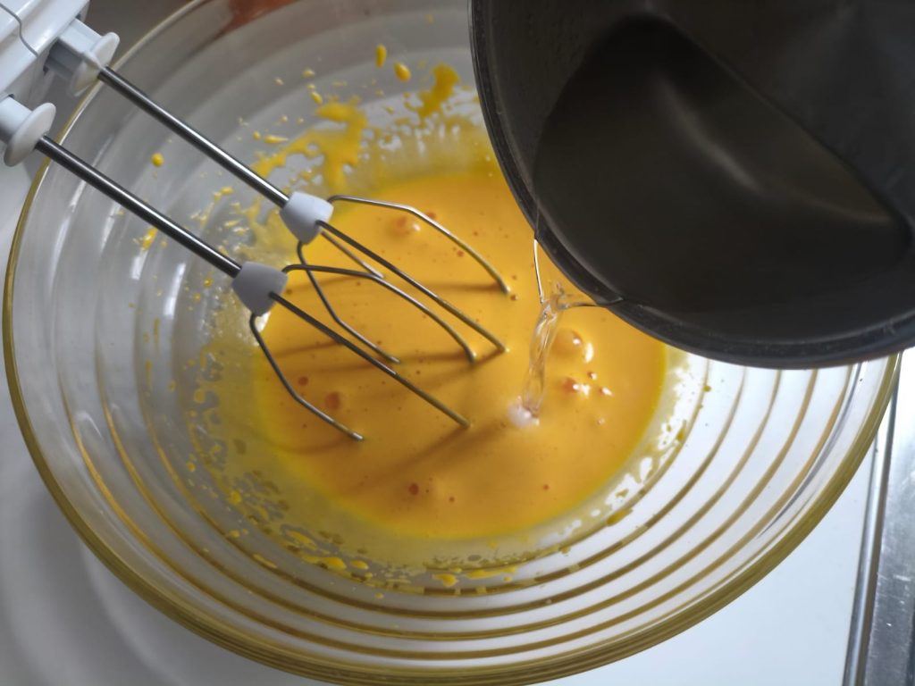 Fügen Sie sie den Eigelben hinzu und schlagen Sie mit den Quirlen.