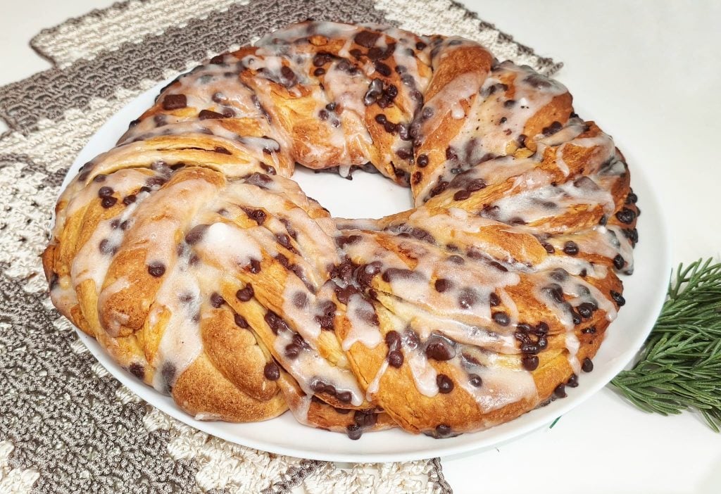 In diesem Hefeteig kannst du alles hinzufügen, was du möchtest. Ich habe Schokoladenstückchen hinzugefügt, aber du kannst ihn auch mit Rosinen und kandierten Orangen oder nur Rosinen oder Nüssen füllen. Der süße Guss darauf wird ihn noch spezieller machen. 😍