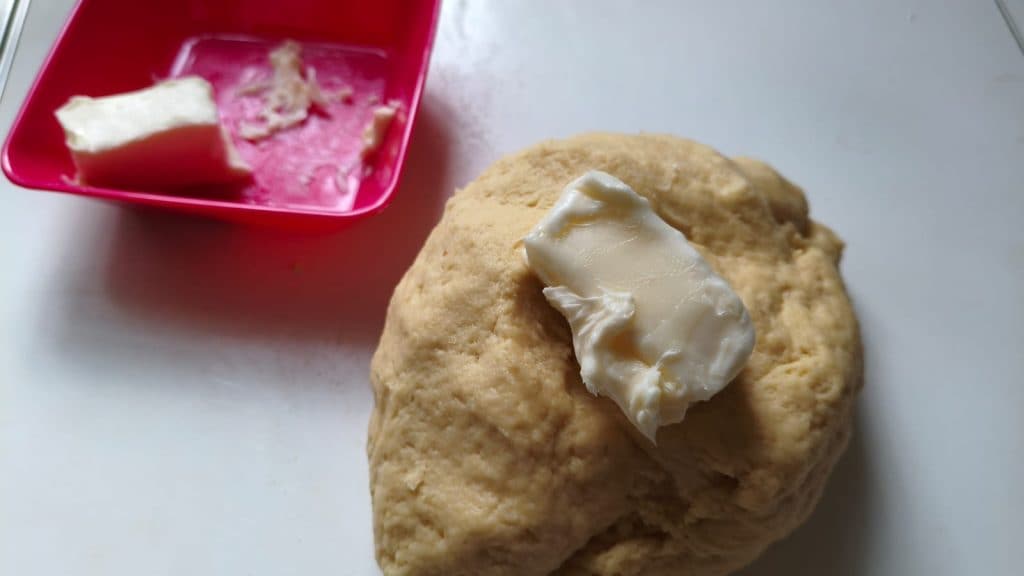 Nun können Sie die Butter nach und nach hinzufügen, während Sie kneten.