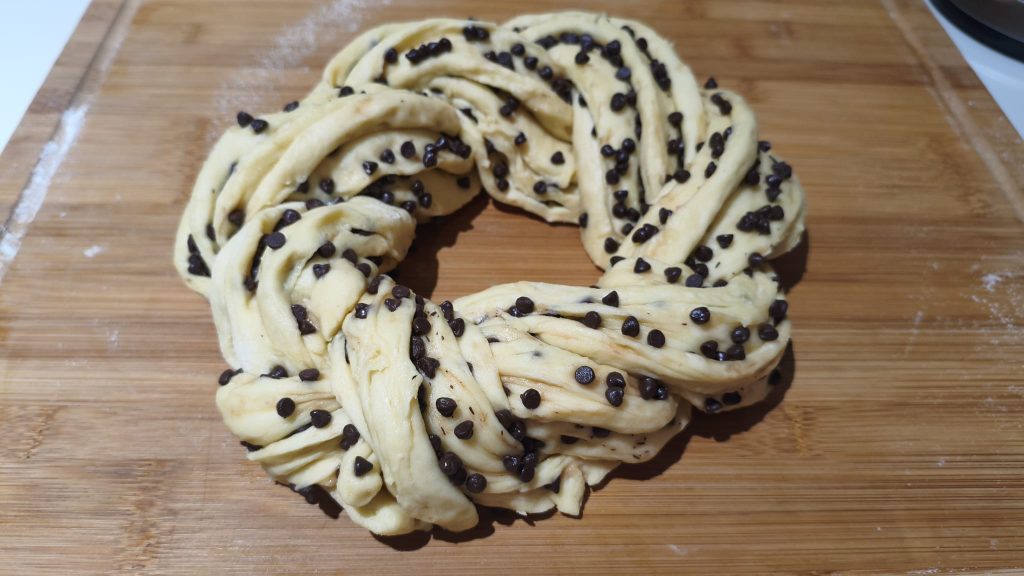 Sobald Sie eine Rolle gebildet haben, teilen Sie sie in zwei Hälften, ohne den Anfang zu schneiden. An diesem Punkt die beiden Teile miteinander verflechten und auf einem Backblech zu einem Kreis formen, dabei auch die Enden verbinden.