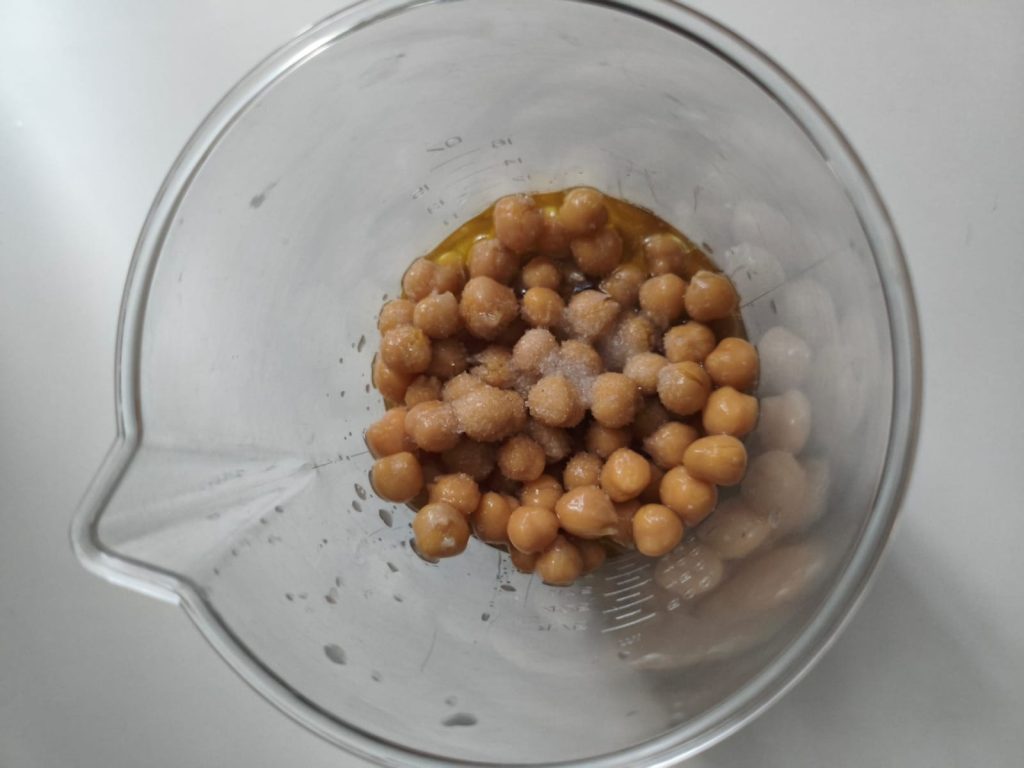 In der Zwischenzeit bereite die Kichererbsencreme zu: Gib die Kichererbsen zusammen mit dem Öl, Zitronensaft und Salz in einen Mixer. Beginne zu mixen und füge nach und nach Wasser oder Brühe hinzu, bis du eine glatte und weiche Creme erhältst.