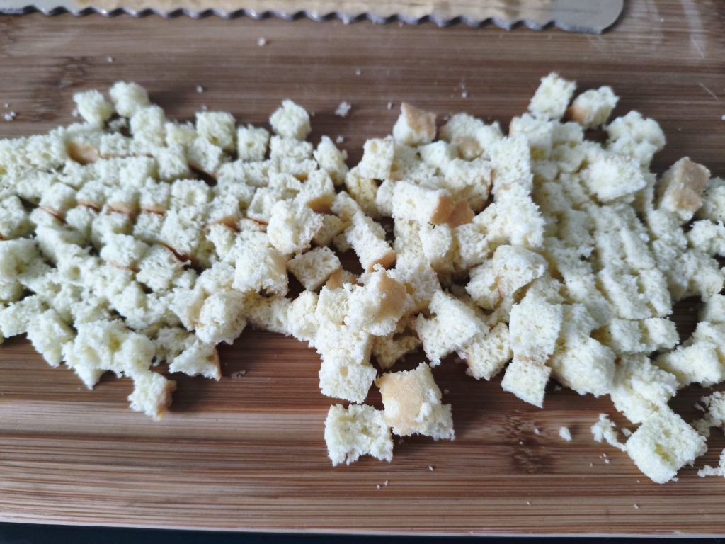 Schneide das zweite Biskuit in kleine Würfel und verteile sie auf der Oberfläche für den Mimosa-Effekt.