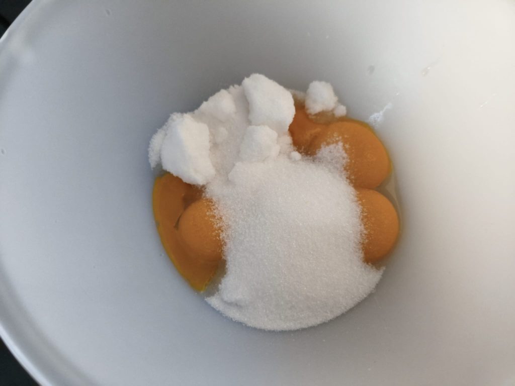 Schlage die Eigelbe mit dem Zucker, dann füge die Maisstärke hinzu.