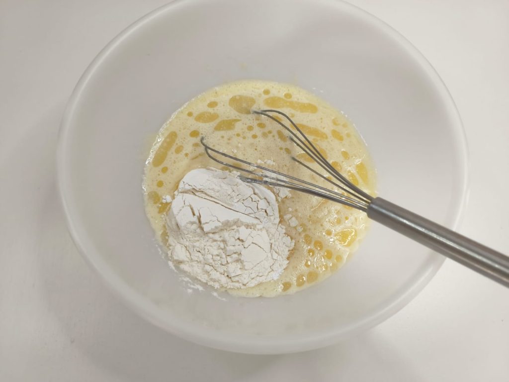 • In einer Schüssel die Eier mit dem Zucker schlagen, bis die Mischung hell ist.