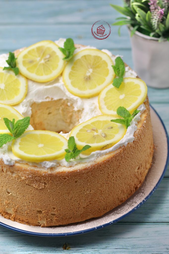Die Angel Cake mit Zitrone ist der Chiffon-Kuchen sehr ähnlich, aber das Besondere ist, dass sie keine Eigelbe enthält, die Angel Cake wird nur mit Eiweiß zubereitet. Außerdem wird wie beim Chiffon-Kuchen die spezielle Form verwendet, die weder eingefettet noch bemehlt wird.