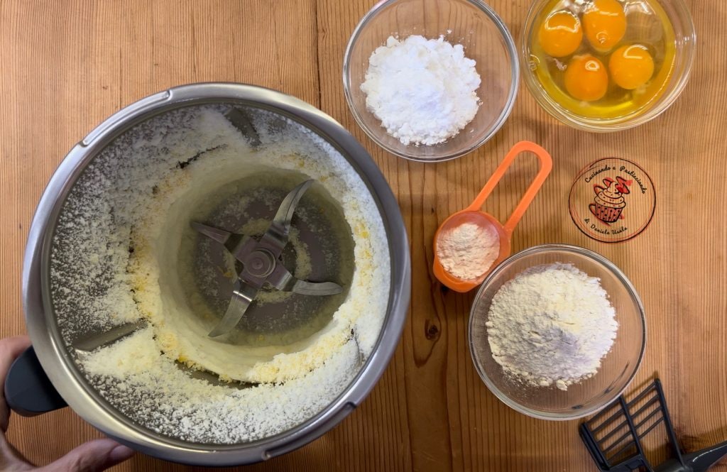 In den Thermomix-Becher Zucker und Zitronenschale geben und 10 Sekunden auf Turbostufe pulverisieren.