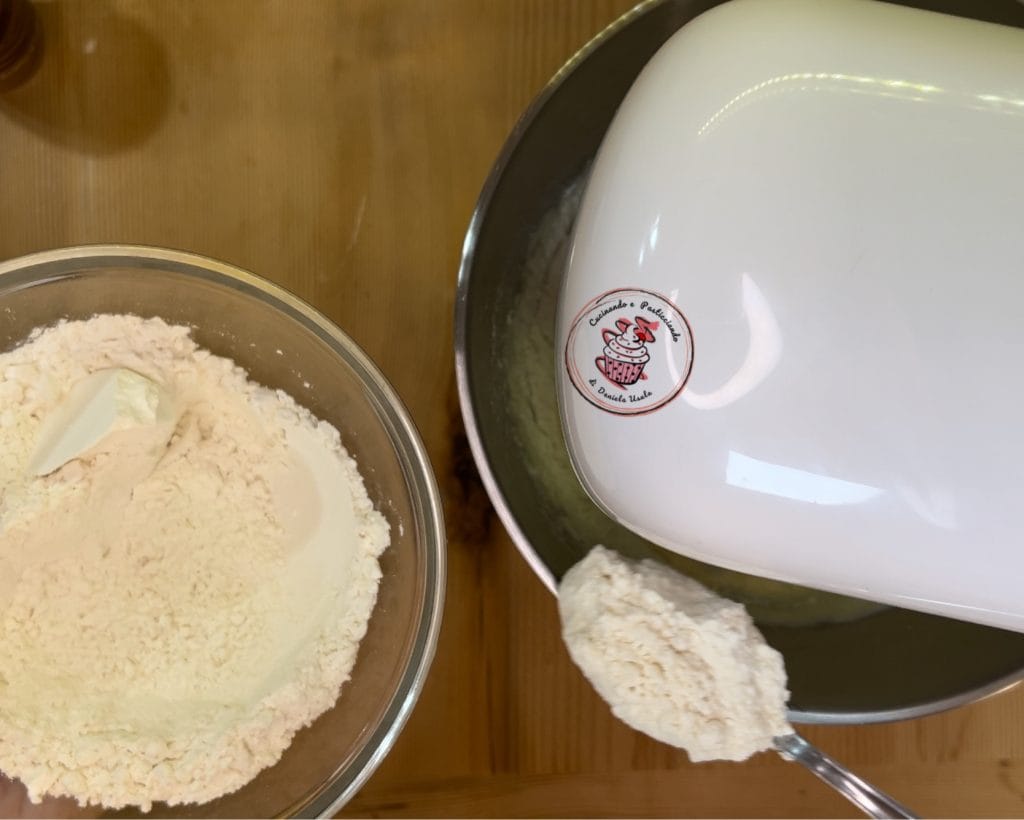 Wir fügen die Butter, die Milch und das mit Backpulver und Vanille gesiebte Mehl hinzu und schlagen weiter für etwa 3 Minuten.
