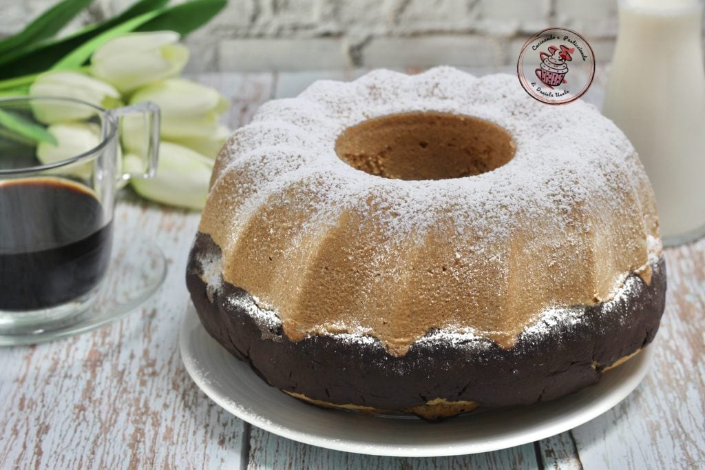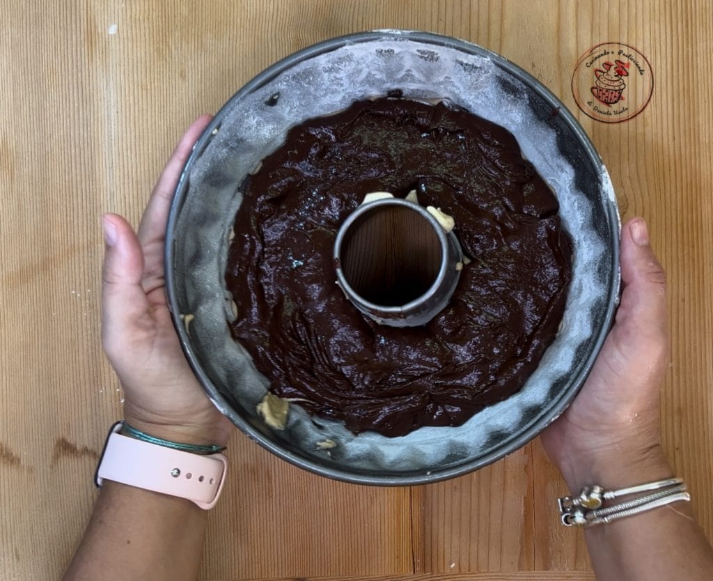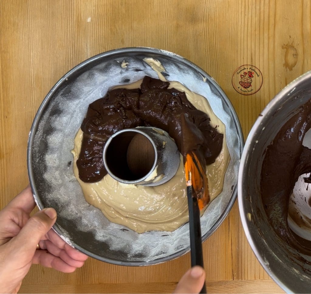 Wir fügen die restliche Milch und den Kakao zum Kaffeeteig hinzu und mischen gut, dann gießen wir den gesamten Kakaoteig auf die beiden Teige in der Form.