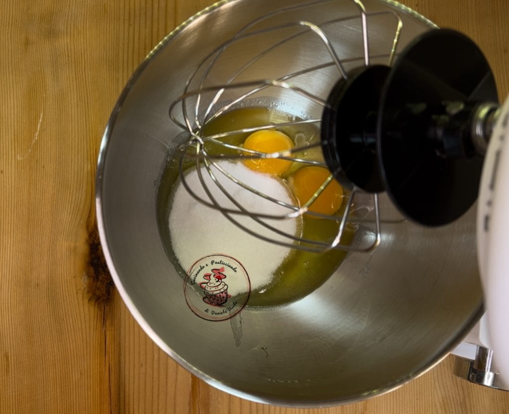 Wir schlagen die Eier mit dem Zucker für etwa 10 Minuten in der Schüssel der Knetmaschine mit dem Schneebesen. Achten Sie darauf, dass alle Zutaten Zimmertemperatur haben.