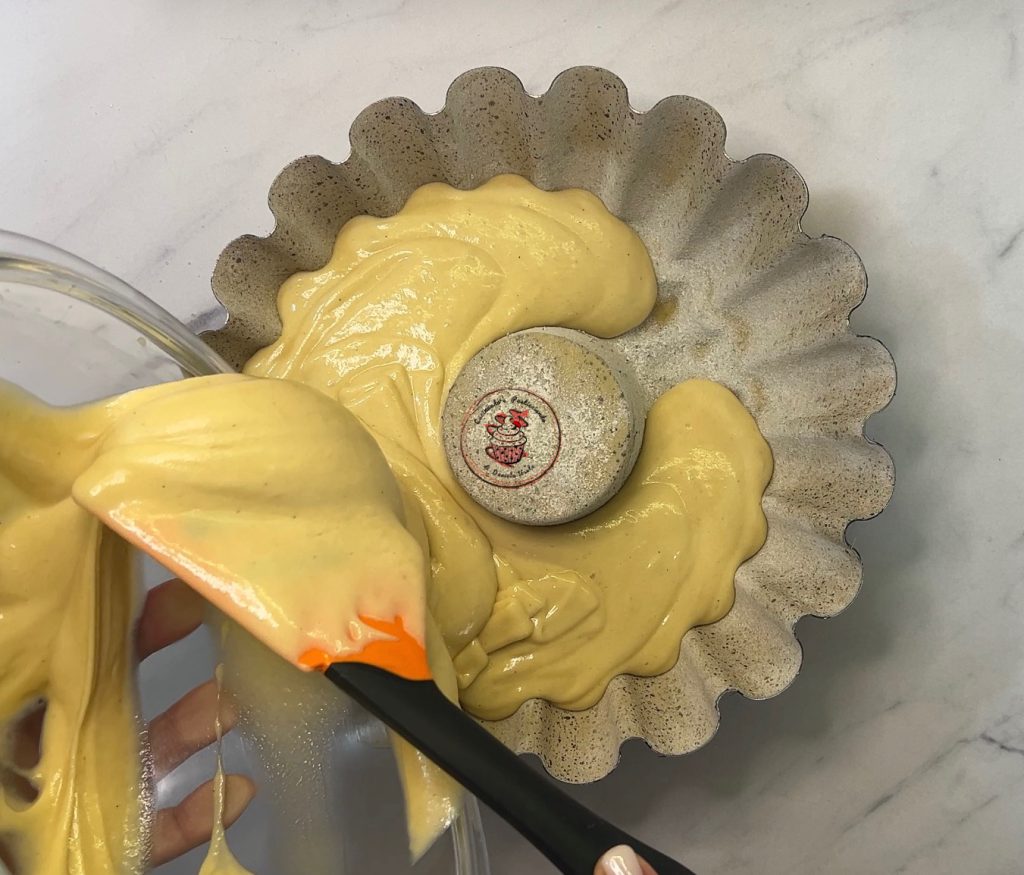 Den Teig in eine gefettete und bemehlte Gugelhupfform füllen und etwa 40 Minuten bei 180 °C backen.