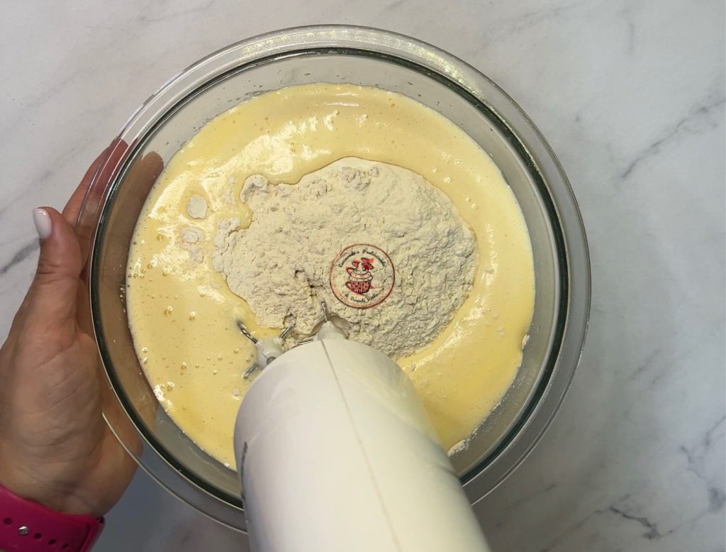 Backpulver mit dem Mehl mischen und die trockenen Zutaten zur Eiermasse geben. Einige Minuten mixen, bis der Teig glatt und klumpenfrei ist.