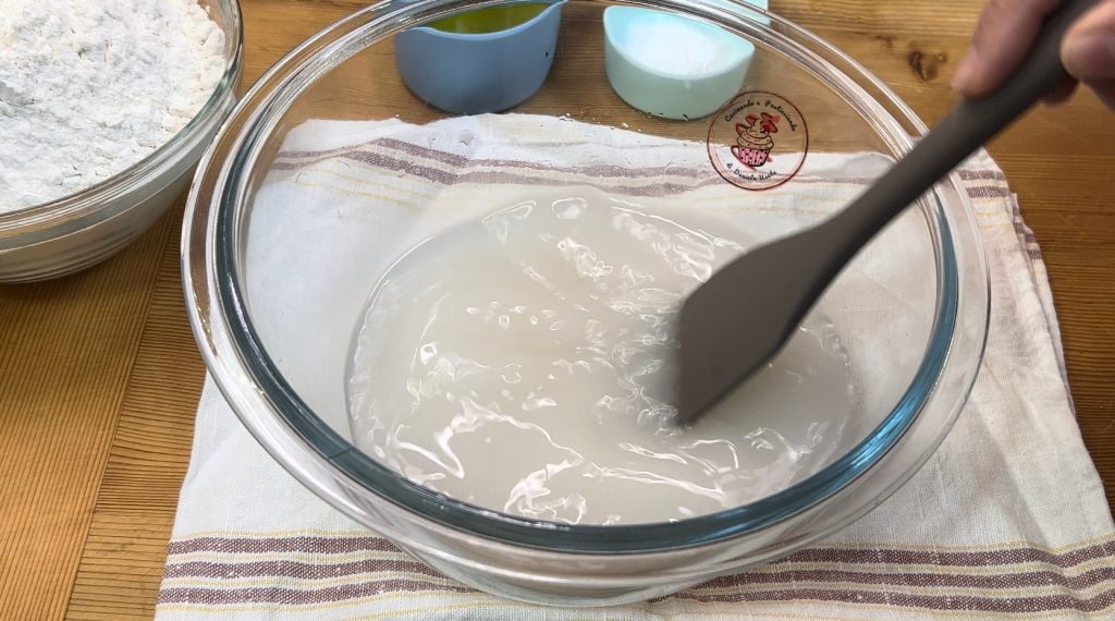 In einer Schüssel den Hefe im Wasser mit dem Zucker auflösen.