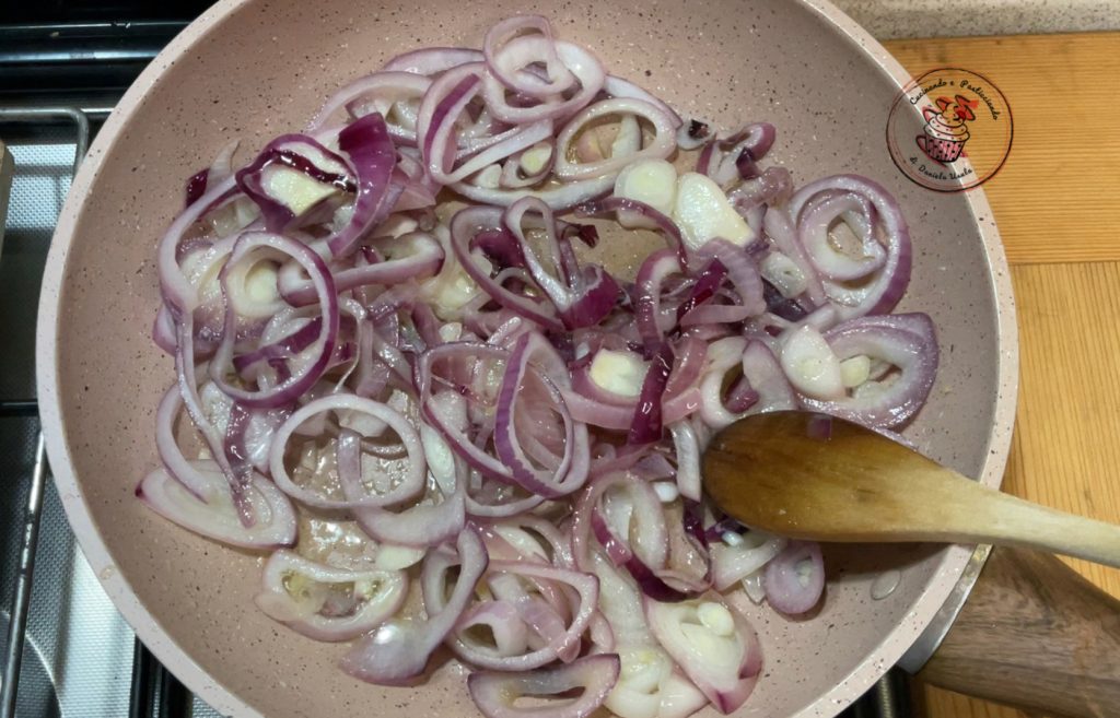 Während der Teig der Focaccia geht, die Zwiebel schälen und in Scheiben schneiden, dann mit etwas Öl und Salz in der Pfanne dünsten.
