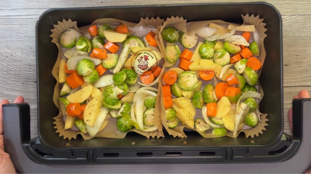 Wenn es eine Möglichkeit gibt, Gemüse selbst den Skeptikern schmackhaft zu machen … dann ist es diese! Das gebackene Gemüse in der Luftfritteuse ist außen knusprig, innen weich und voller Geschmack. In diesem Rezept habe ich Rosenkohl, Karotten, Zwiebeln und Kartoffeln kombiniert, um eine bunte, gesunde und sehr einfache Beilage zu kreieren. Perfekt, um Fleisch- oder Fischgerichte zu begleiten, aber auch als leichte Hauptspeise!