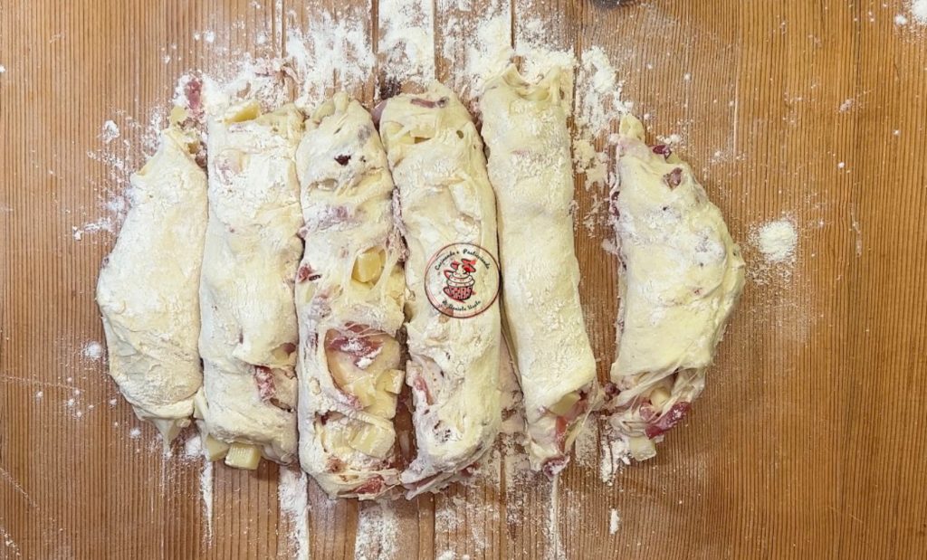 • Rolle den Teig wieder wie ein Laken aus und fülle ihn mit Speck und Provola.