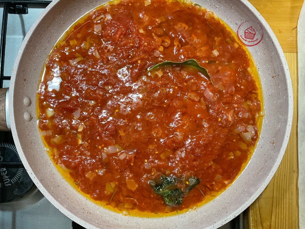 In der Zwischenzeit die Sauce vorbereiten. Die Aromen gut anbraten und die Tomatenpulpe etwa 15 Minuten kochen.