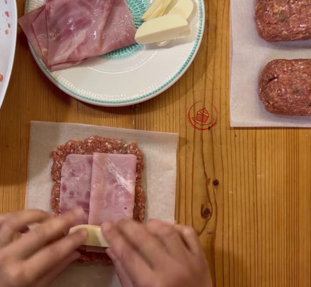 Dann eine kleine Menge Teig nehmen und auf ein Stück Backpapier legen und eine Scheibe Schinken und ein Stück Käse darauf platzieren.