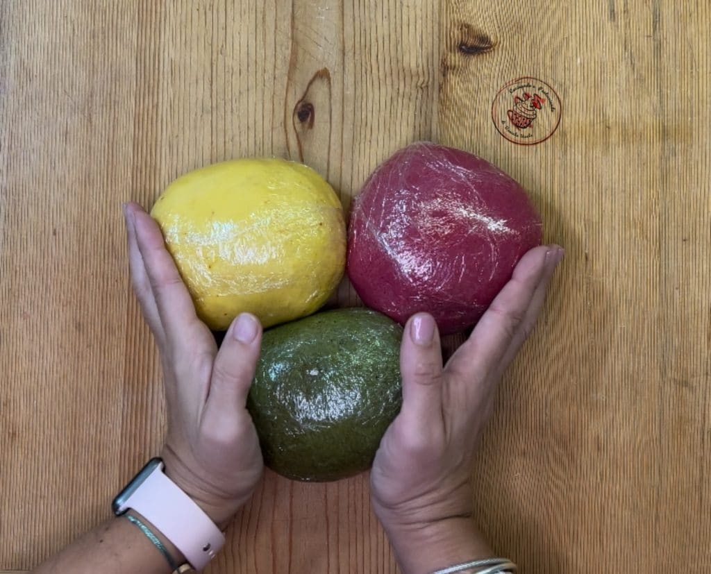 • Nach der Ruhezeit den Teig nehmen und für jede Farbe Stränge formen, diese in Stücke schneiden.