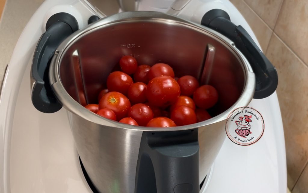 Die gut gewaschenen Kirschtomaten in den Bimby geben und 30 Sekunden auf Stufe 10 pürieren. Weitere Tomaten hinzufügen und nochmals 1 Minute auf Stufe 10 pürieren.