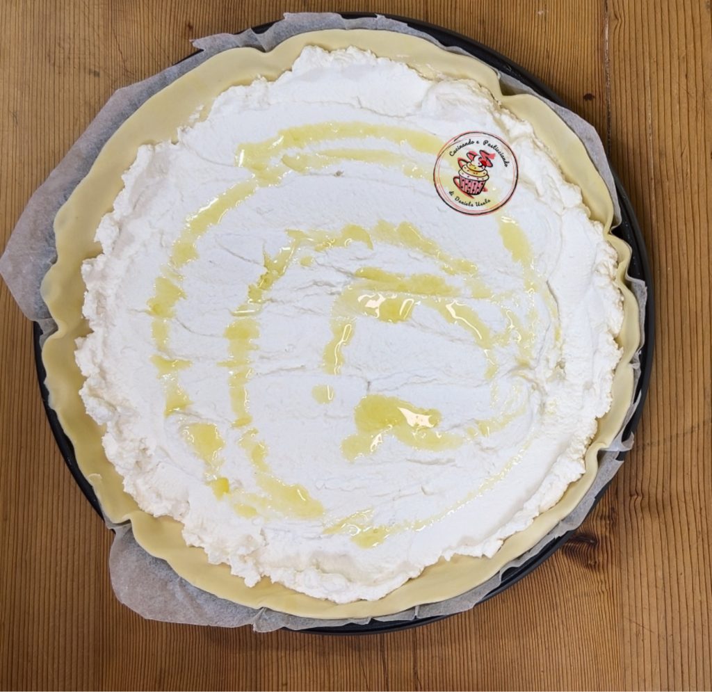 Den Blätterteig auf dem Backblech ausrollen und die Ricotta darauf verteilen. Mit Öl und Salz würzen. Wenn Sie die Mikrowelle benutzen, verwenden Sie den Crisp-Teller (spezieller Antihaft-Teller für die Mikrowelle).