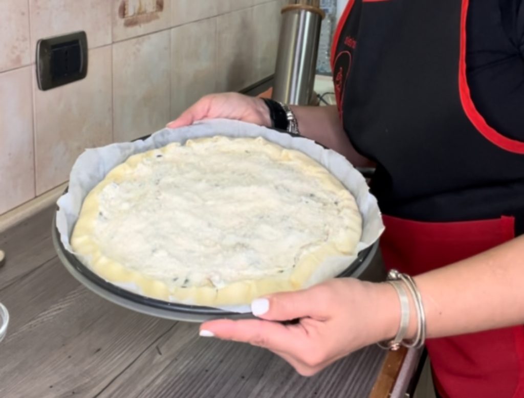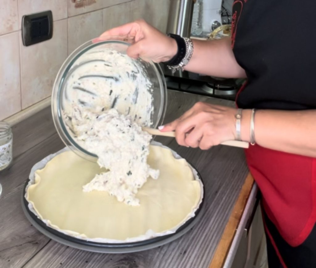 In eine Schüssel geben wir den Ricotta, das Ei, die in Würfel geschnittene Speck, den Thunfisch und die Zucchini, die in Würfel geschnitten und mit Öl und Salz 10 Minuten in der Heißluftfritteuse gegart wurde.