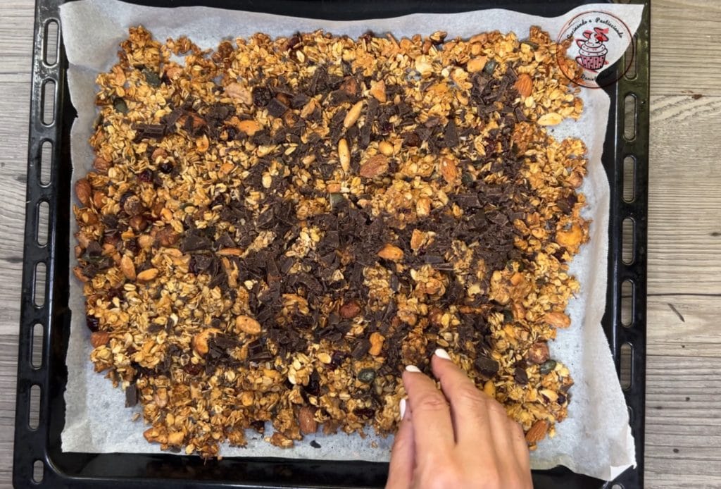 Wenn das Granola abgekühlt ist, die Schokolade hinzufügen und in einem luftdichten Behälter aufbewahren.