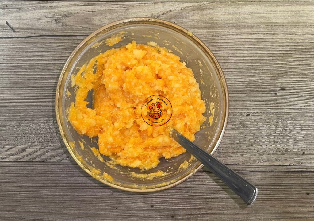 • In eine Schüssel den pürierten Kürbis und die Kartoffel geben. Ei, geriebenen Käse, aromatisiertes Salz und die mit Knoblauch und Petersilie zerkleinerten Semmelbrösel hinzufügen.