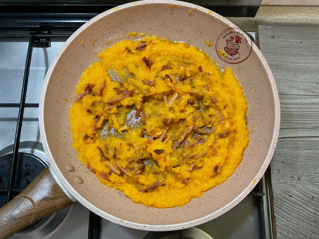 Wenn der Kürbis weich ist, pürieren und zusammen mit dem Speck wieder in die Pfanne geben.
