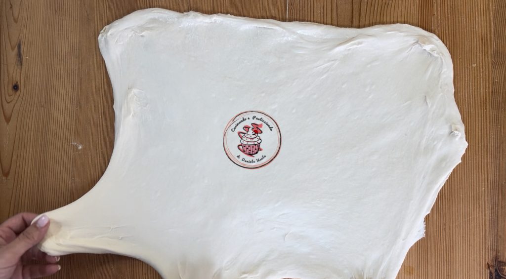 Den Teig auf der Arbeitsfläche ausrollen und ein paar Falten einarbeiten.