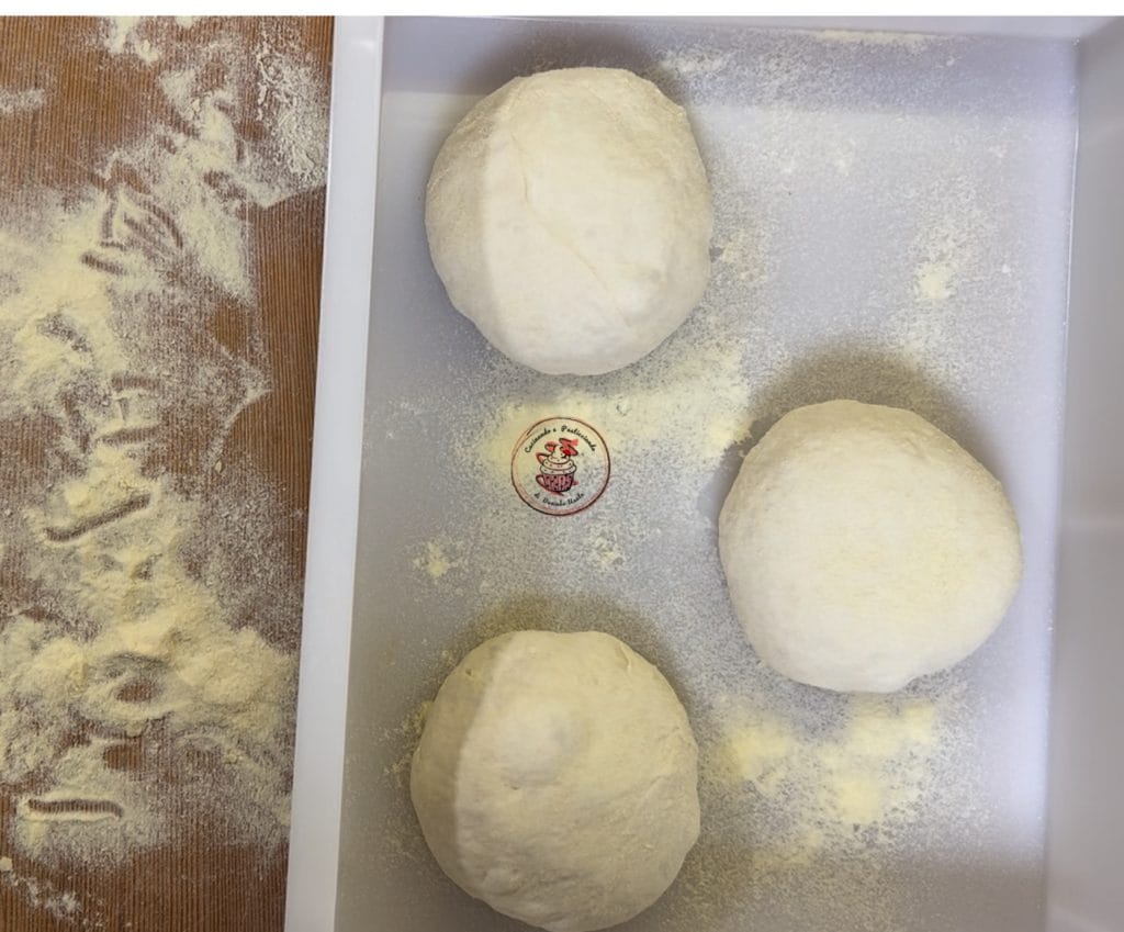 Den Teig in 3 Kugeln à ca. 280 g teilen. Und diese für etwa 2 Stunden im Behälter gehen lassen.