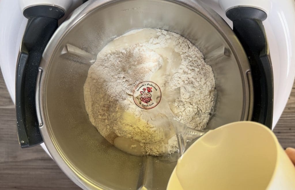 In den Mixtopf des Bimby das Mehl, die Hefe und 340 g Wasser geben. 2 Minuten auf Knetstufe kneten.