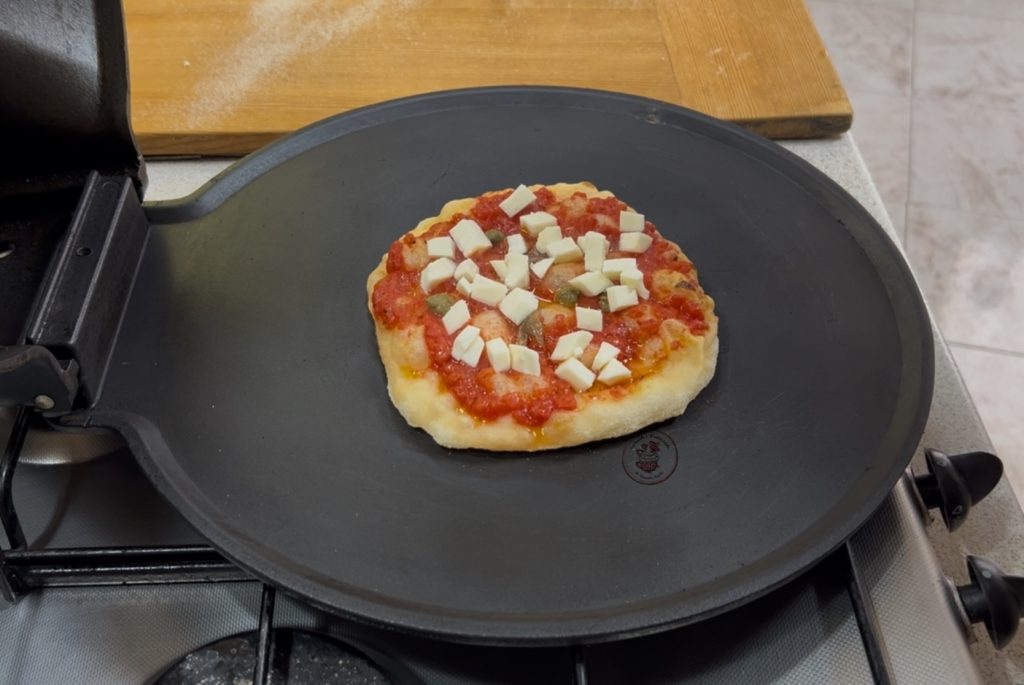 • Wir würzen sie mit Tomatensoße, Kapern und Sardellen und backen sie etwa 3 Minuten.