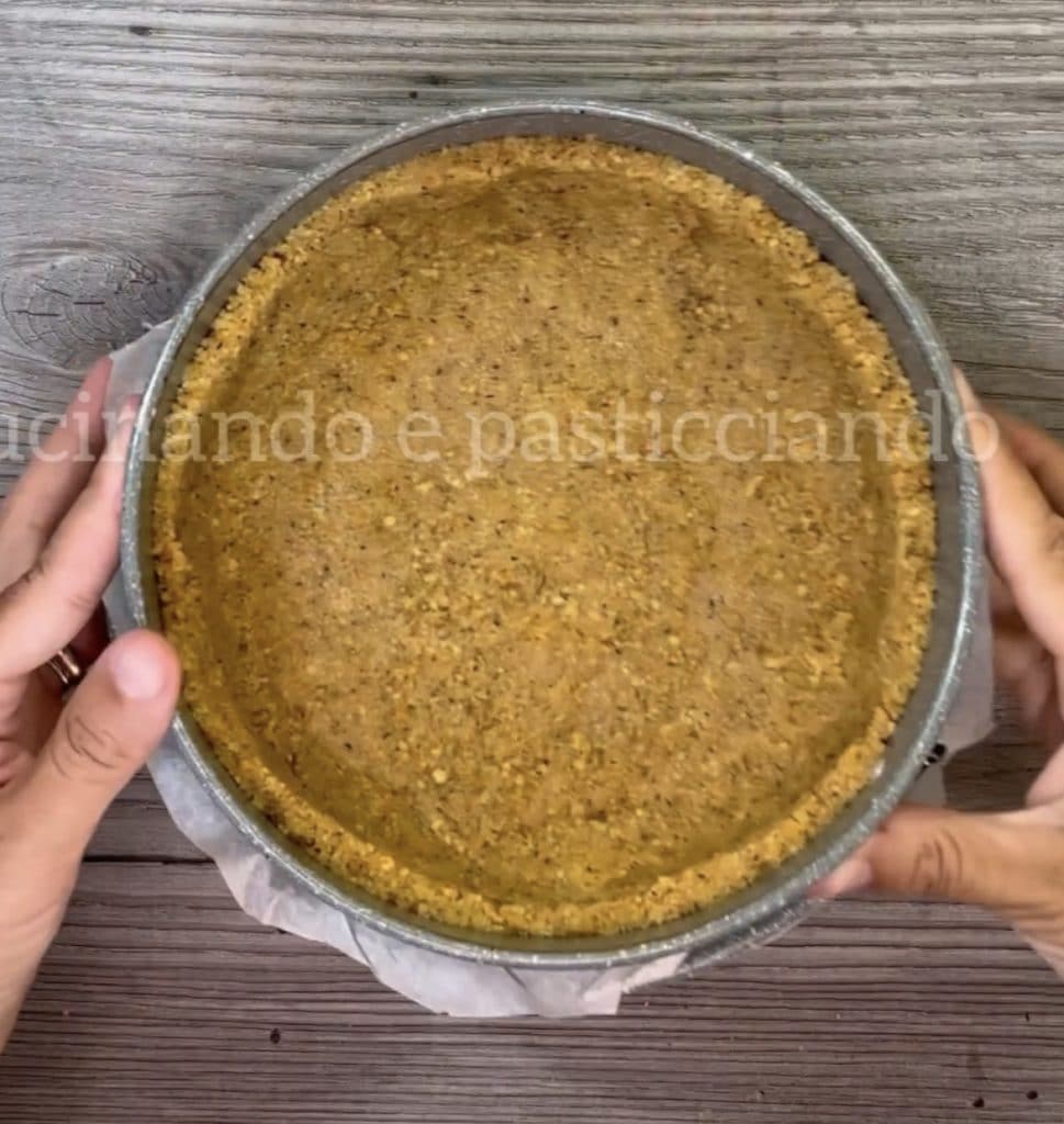 Den Boden wieder herausnehmen, die Haselnusscreme darauf geben und mit dem restlichen Keksmasse bedecken. Dabei über die Oberfläche krümeln.