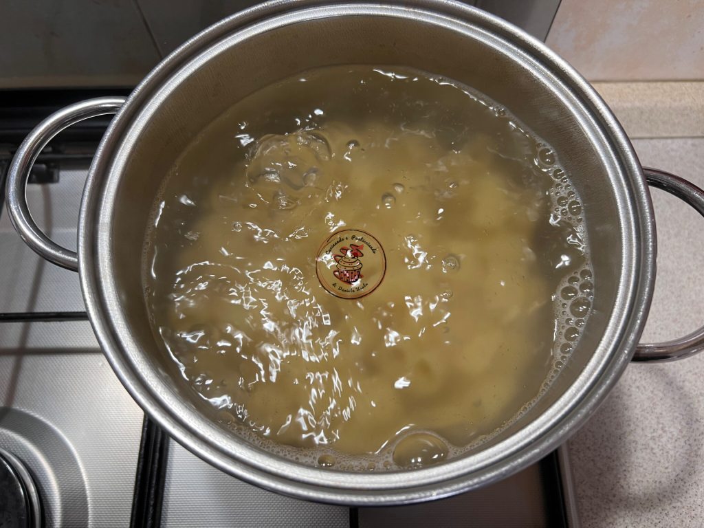 In der Zwischenzeit die Pasta in reichlich gesalzenem Wasser gemäß den Anweisungen auf der Verpackung kochen.