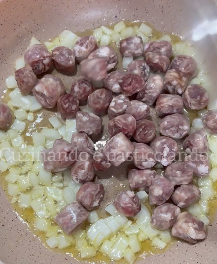 In einer Pfanne die Wurststücke mit der gehackten Zwiebel etwa 10 Minuten anbraten.