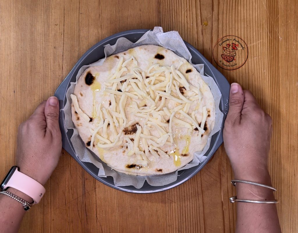 • Die Backform mit Backpapier auslegen und das erste Fladenbrot darauflegen.