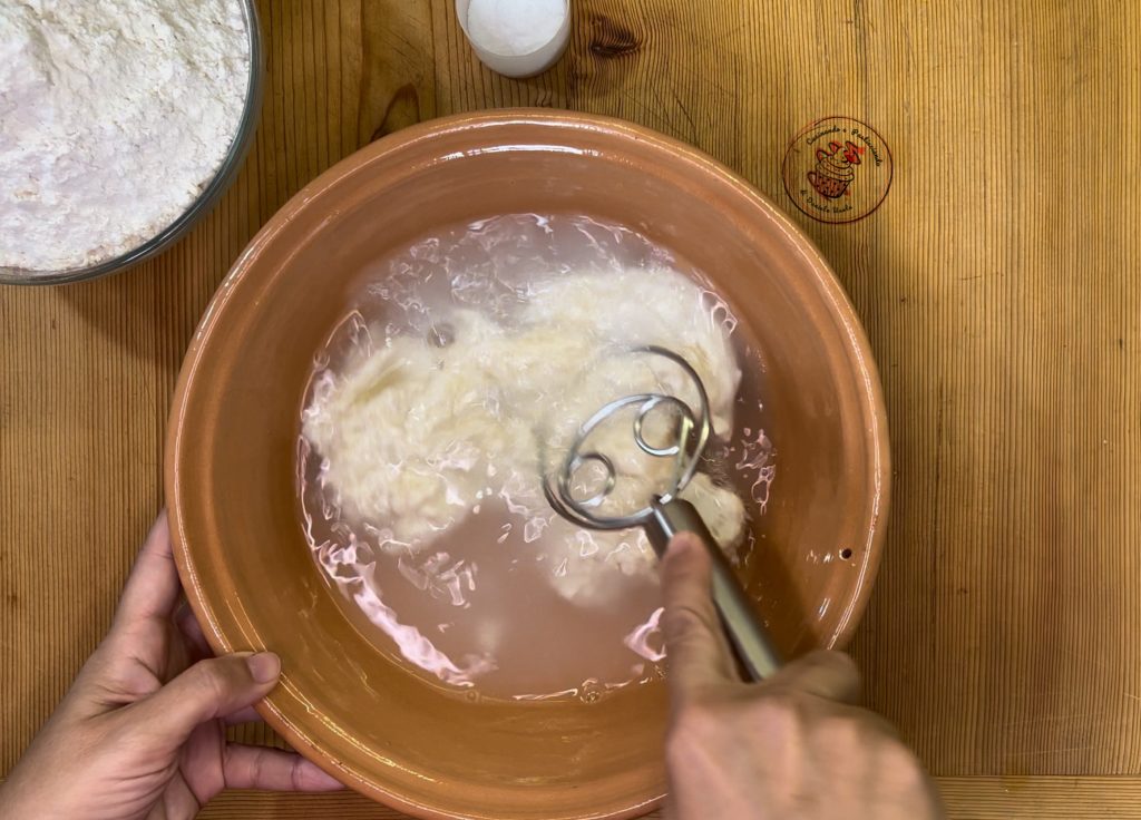 Fügt das Salz hinzu und knetet, bis der Teig das gesamte Salz aufnimmt. Jetzt macht drei Faltvorgänge im Abstand von jeweils 15 Minuten.