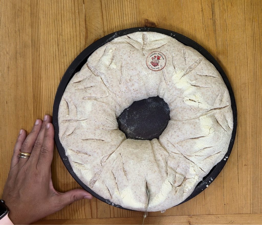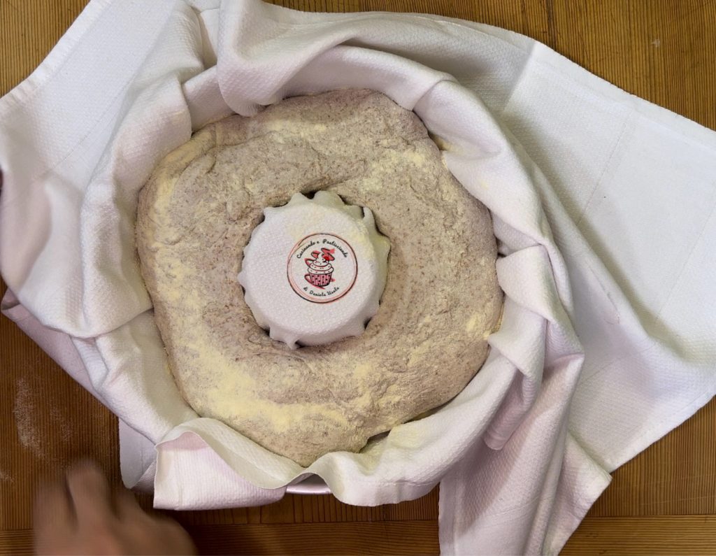 Nachdem der Teig aufgegangen ist, auf die Arbeitsfläche geben. Leicht mit den Händen ausbreiten und ein Loch in der Mitte formen. Den entstandenen Kranz auf eine mit einem mit Mehl bestäubten Tuch ausgelegte Kranzform legen.