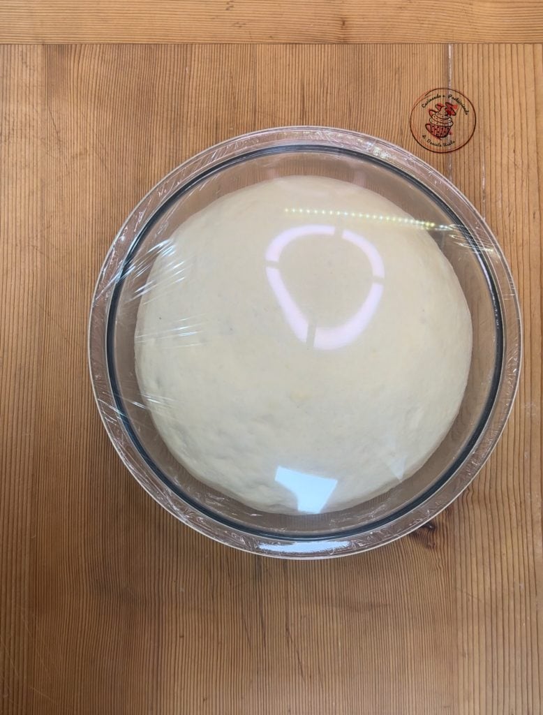 Die Hefe im Wasser und der Milch mit dem Zucker 30 Sekunden bei Geschwindigkeit 2 auflösen. Das Mehl hinzufügen, 5 Minuten auf Knetgeschwindigkeit einstellen. Das Salz und das Schmalz hinzufügen und weitere 3 Minuten kneten, ebenfalls auf Knetgeschwindigkeit. Auf das Nudelbrett übertragen und in einer Schüssel abgedeckt mit Folie bis zur Verdopplung ruhen lassen.