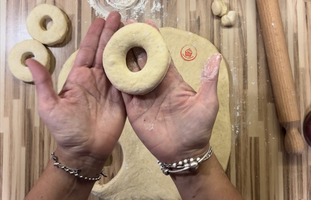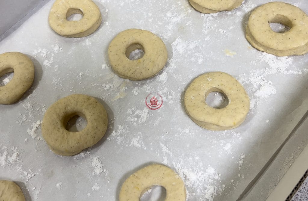 Mit der Donut-Form habe ich die Donuts geformt und sie etwa eine Stunde gehen gelassen, bis sie sich verdoppelt haben.