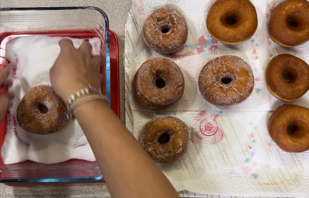 Ich habe sie dann in heißem Öl frittiert, auf Küchenpapier abtropfen lassen und schließlich in Kristallzucker gewälzt.