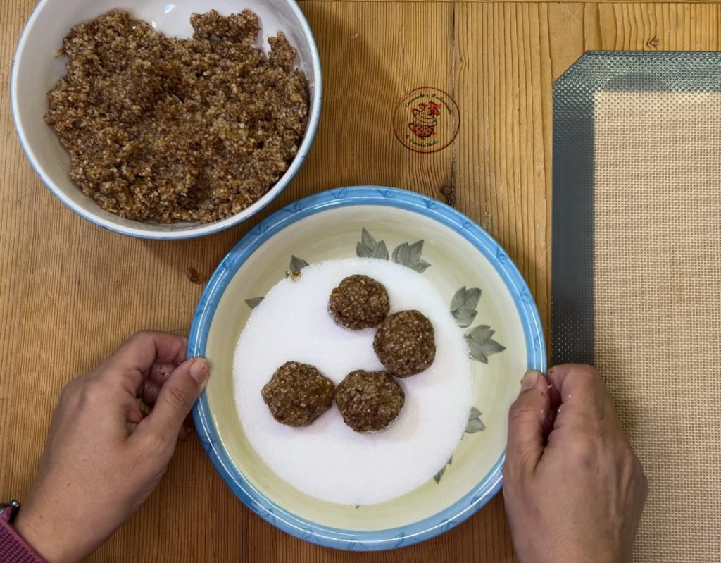 Kugeln in der Größe einer Walnuss formen und im Kristallzucker wälzen.