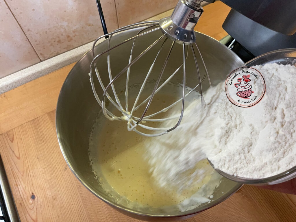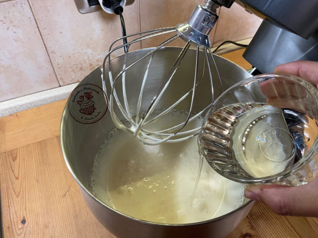 Zucker mit den Eiern in der Küchenmaschine etwa 10 Minuten schlagen, bis sie schaumig und voluminös sind.