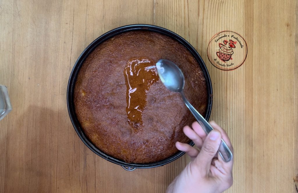 Wenn der Kuchen fertig ist, tränken Sie ihn, ohne ihn aus der Form zu nehmen, mit dem Ananassaft. Dann auf eine Servierplatte umsetzen und servieren.