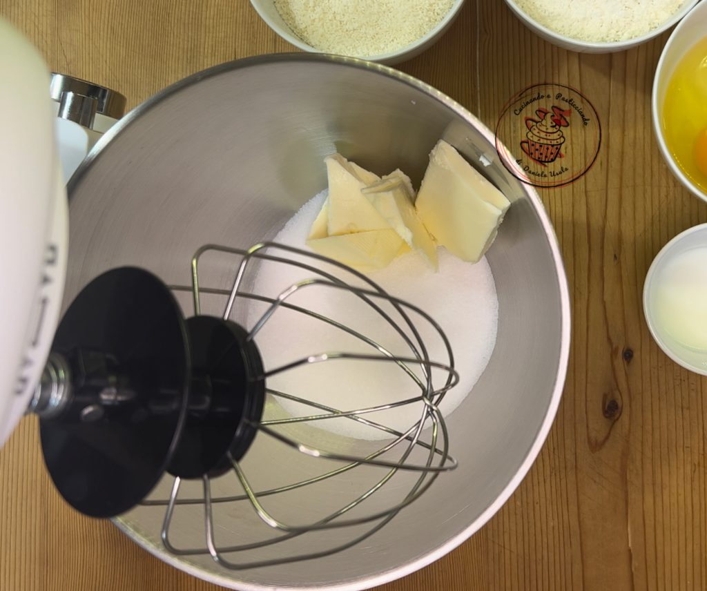 In die Schüssel der Küchenmaschine geben wir Zucker und Margarine und schlagen für einige Minuten auf. Verwenden Sie den Schneebesen.