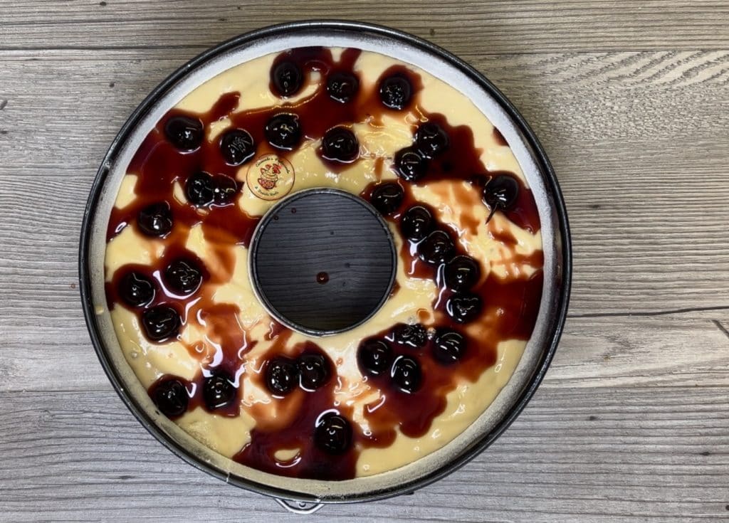 Die Mischung in die gefettete und bemehlte 24 cm Kranzform gießen. Einige Kirschen und etwas Sirup auf die Oberfläche geben und bei 180° ca. 40 Minuten backen.