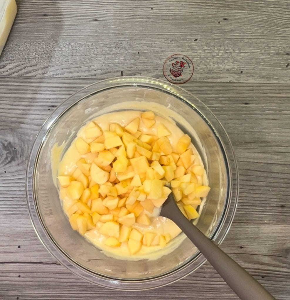 Fügen Sie das Öl, die Milch, das Mehl, die Vanille und das Backpulver hinzu und mischen Sie gut, um alle Klumpen aufzulösen. Schließlich 2 Äpfel in Stücke geschnitten.