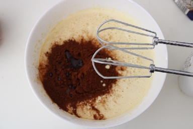 In der Schüssel die Eier mit dem Zucker mit den elektrischen Schneebesen schlagen, bis du eine luftige und helle Mischung hast. Gib die Milch langsam dazu und schlage weiter. Füge die im Wasserbad geschmolzene Schokolade mit der Butter, das Kakaopulver und das gesiebte Mehl mit dem Backpulver hinzu. Schlage weiter, bis du eine sehr glatte und homogene Mischung hast.